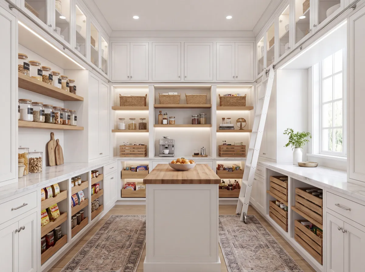 Beautifully organized custom walk-in pantry with floor-to-ceiling white cabinetry, open shelving, and pull-out drawers, bright clean lighting, photorealistic